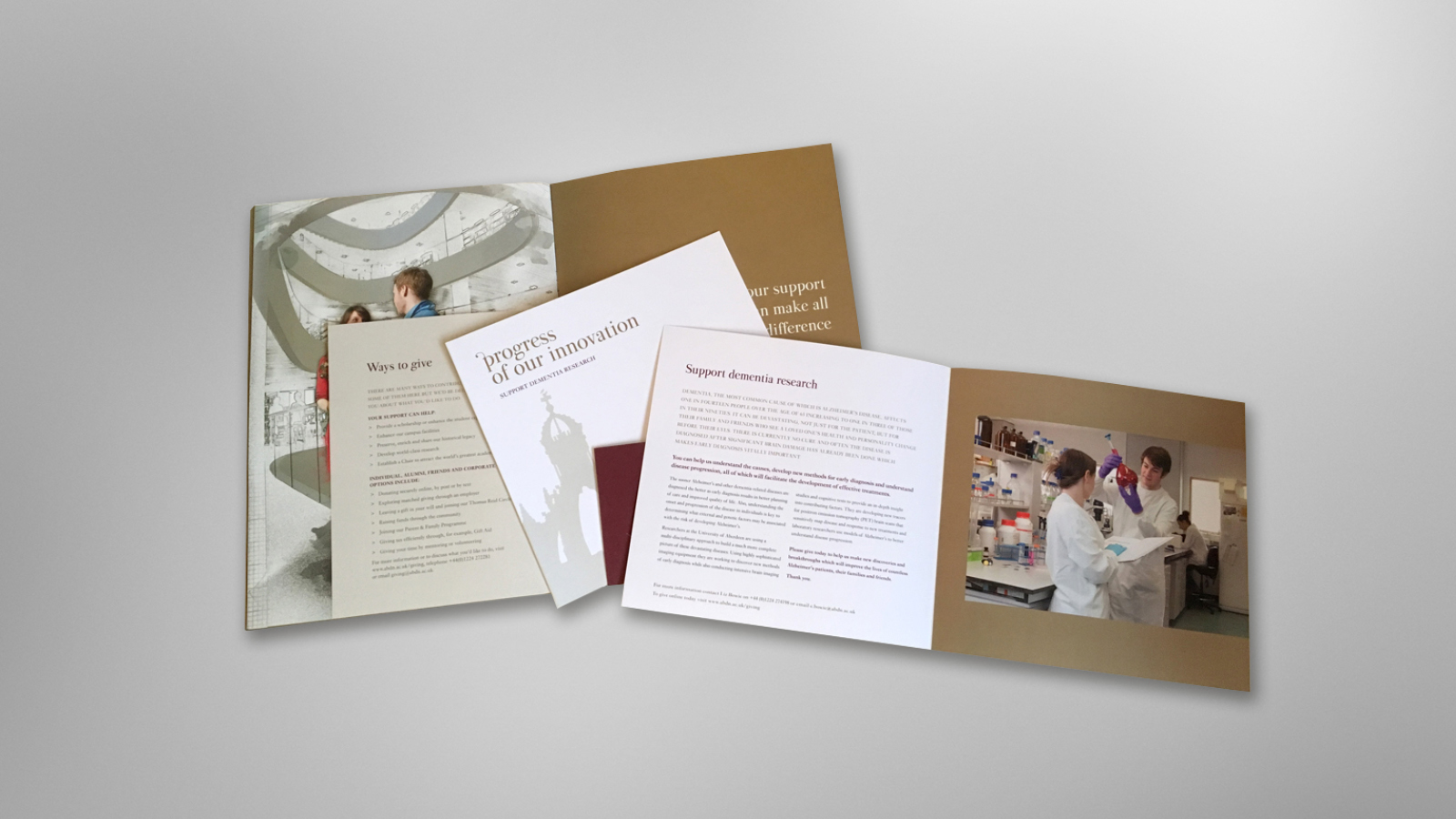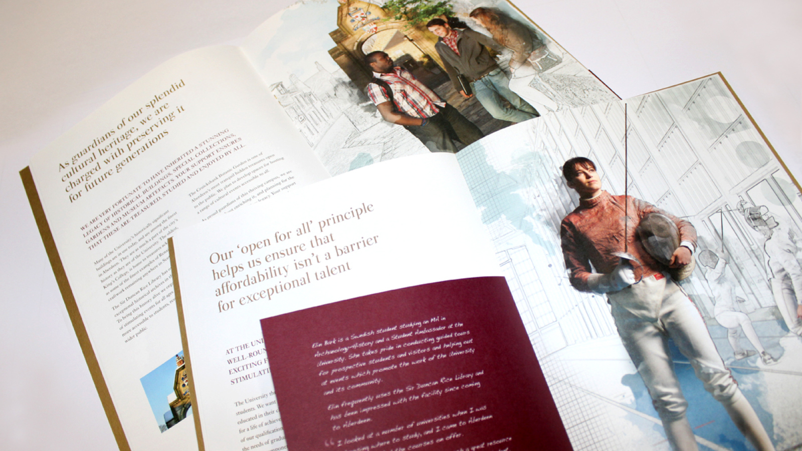 I have been working with The University of Aberdeen Development Trust for several years at Raven Red and at Fifth Ring. I was initially involved in the creation of the identity and design styling of the corporate brochure. Other items such as the annual reviews, leaflets, posters, banners and adverts have also been created. Photography was commissioned and then an illustrator created the artistic images over this. Stylish production techniques including embossing, gold foil blocking and different sized pages, on a high-end stock created an up-market brochure which as a bit different.